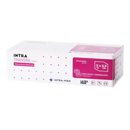 Przylepiec INTRA TRANSPA TAPE to produkt wykonany z wysokiej jakości folii PE, który swoim uniwersalnym zastosowaniem bardzo dobrze sprawdza się przy mocowaniu opatrunków jak i jednorazowego sprzętu medycznego. Jako jedyny produkt z oferty bez problemu można dzielić go wzdłuż i w poprzek bez potrzeby stosowania nożyczek. Dzięki zastosowaniu specjalnych mikroporów plaster można także przerwać w środku co jest idealnym zastosowaniem przy np.: mocowaniu wszelkiego rodzaju rurek tracheostomijnych i innych.